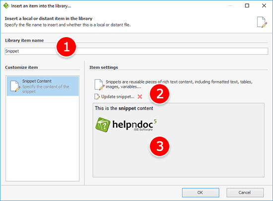 Snippets are very similar to variables: the snippet is placed within topics and will be replaced by its current value at generation time. They can be useful in multiple situations: